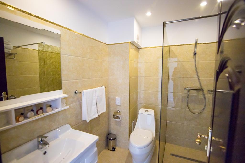 - 3 camere duble King (dormitor cu pat si canapea extensibila 25mp, baie 10 mp. dotata cu dus si cada hidromasaj / vedere laterala la mare).
