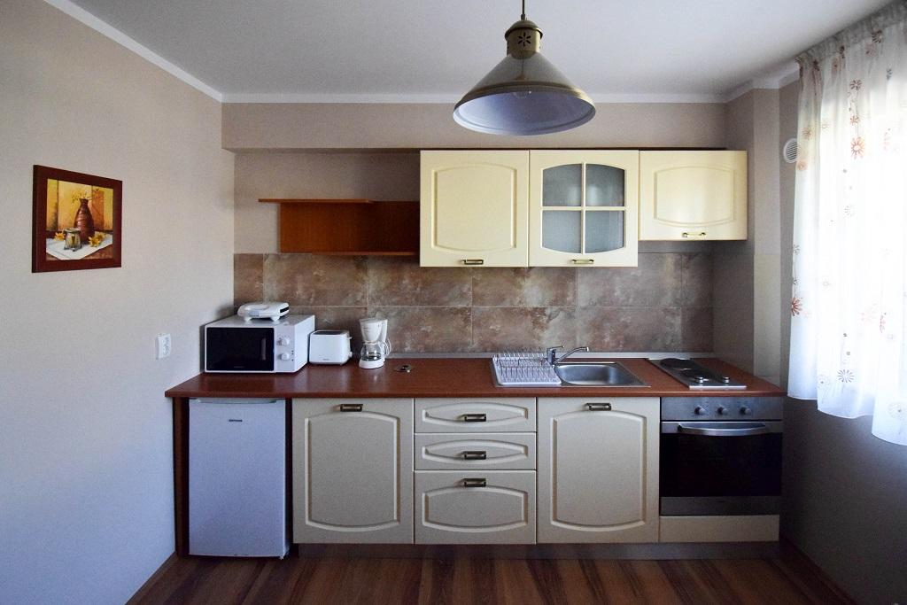 * Bucatarie dotata cu: plita electrica, cuptor electric, frigider, cuptor microunde, cafetiera, sandwich maker, vesela, tacamuri