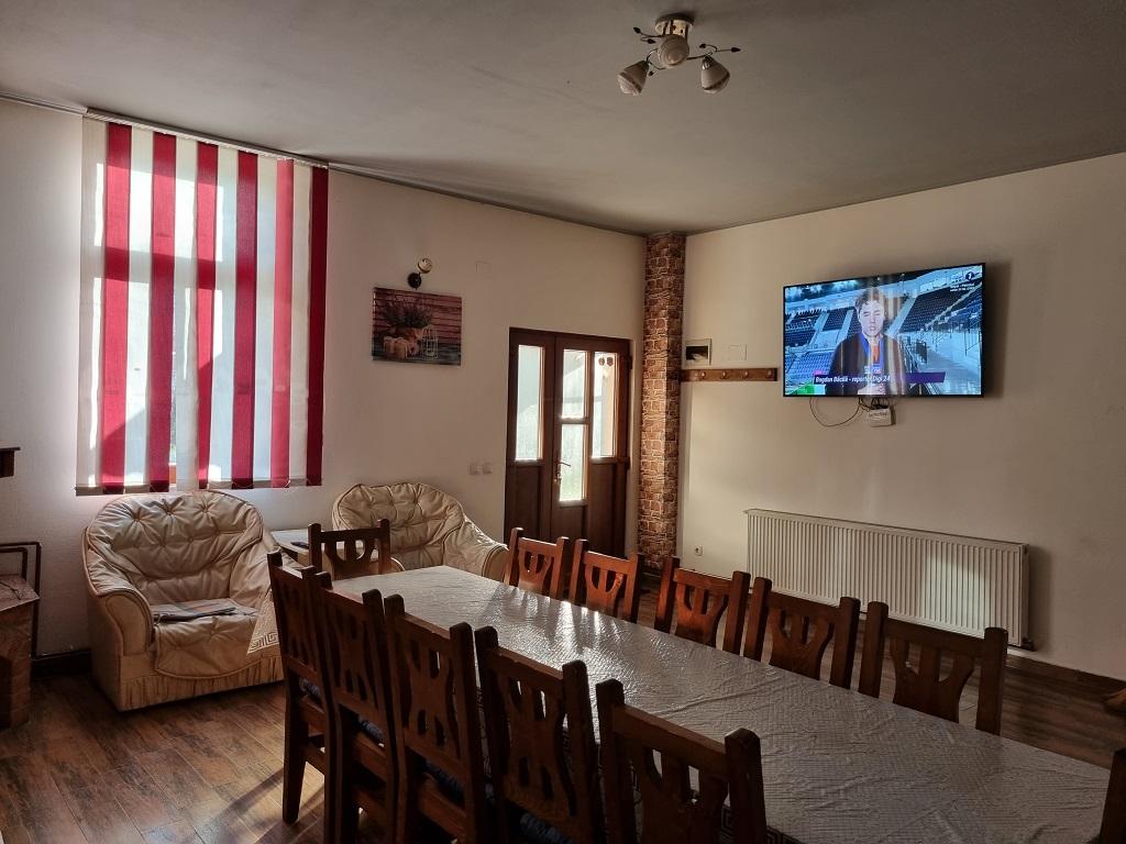 Acces la bucatarie(complet dotata) si salon mare( incalzire centrala tip semineu ce incalzeste toata casa). Salonul dispune de un TV, o canapea cu 2 fotolii, masa de 14 persoane si 2 boxe. In curte se afla foisorul si gratarul. Exista locuri de parcare.