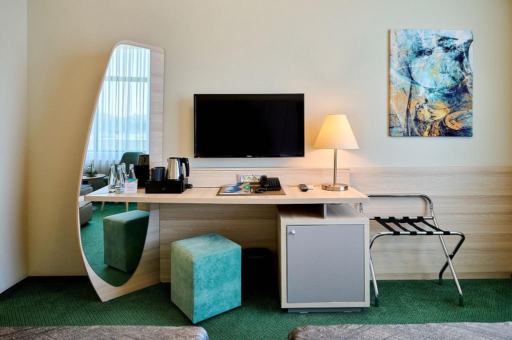 Pentru a surprinde in continuare in mod placut oaspetii, hotelul a continut seria modernizarilor in spatiile interioare comune si in iarna anului 2021. De asemenea, zona piscinei a fost modernizata prin constructia unei noi piscine pentru adulti (adancime 120-150 cm) si copii (adancime 50 cm). Astfel, hotelul are 6 etaje si este deservit de 2 lifturi si 150 spatii de cazare (dintre care 22 sunt apartamente, 75 sunt camere duble cu paturi twin si 47 camere duble cu paturi matrimoniale si 6 camere triple). Interioarele hotelului sunt spatioase si luminoase, camerele fiind amenajate in bejuri calde cu accente elegante verzi.