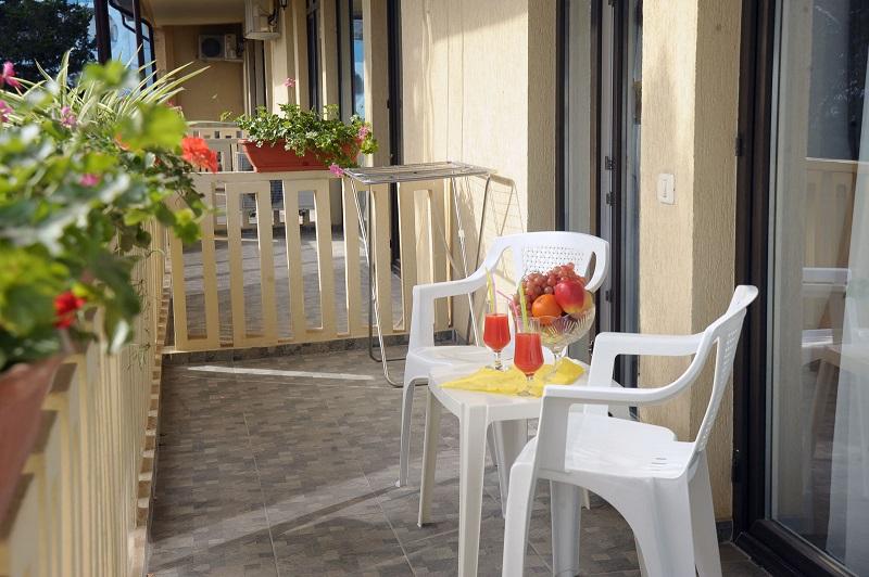Toate camerele dispun de pat matrimonial (160/200cm), aer conditionat, televizor LCD, frigider, baie cu dus, uscator de par, balcon cu uscator de rufe, plasa de tantari.