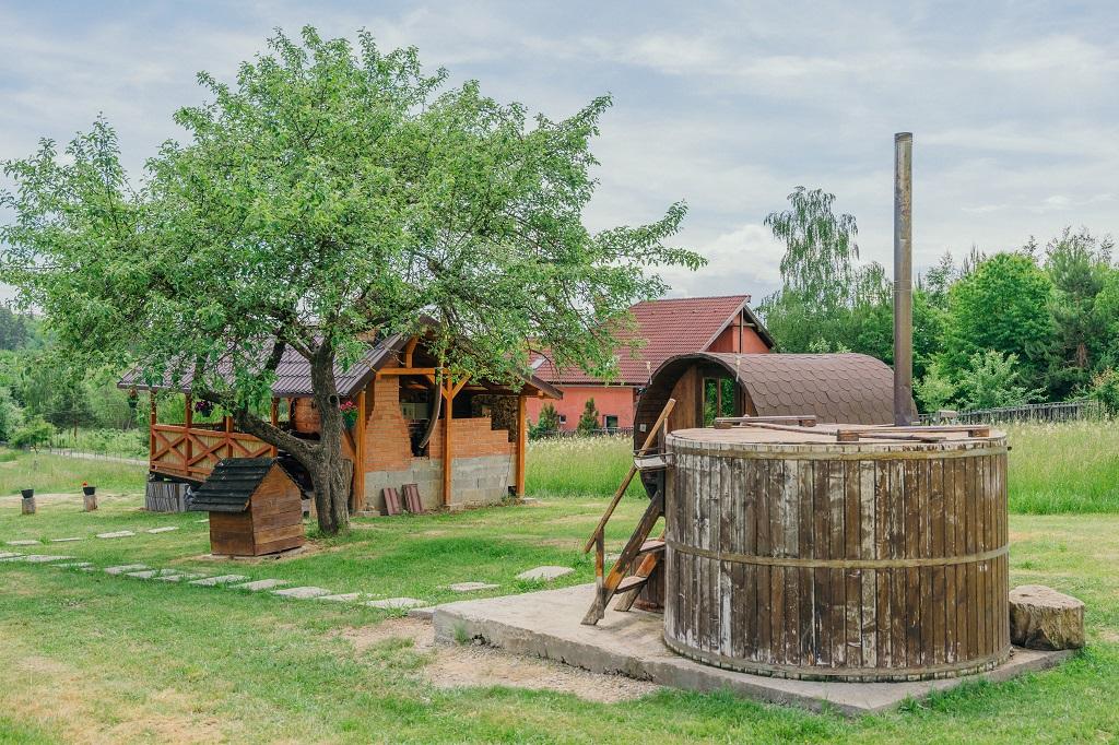 °Ciubar exterior încălzit 6-8 persoane (hot tub), sauna in butoi, foisor, posibilitatea de grătar/ceaun, parcare generoasa, biciclete.