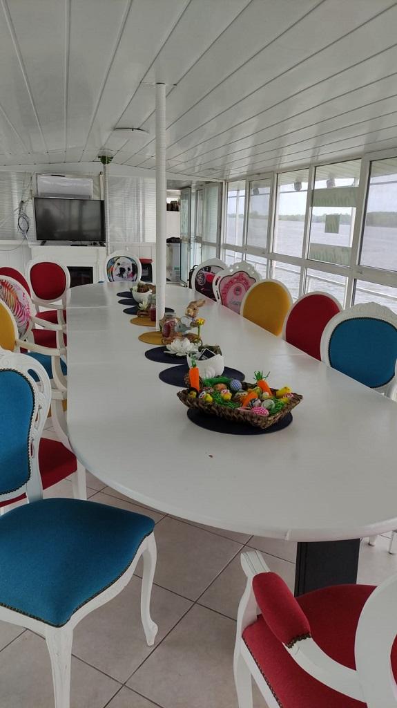 Pontonul detine 9 camere duble cu baie proprie , sala de luat masa in incinta pontonului, terasa de luat masa, terasa de odihna, gratar, wi-fi, parcare in fata pontonului.