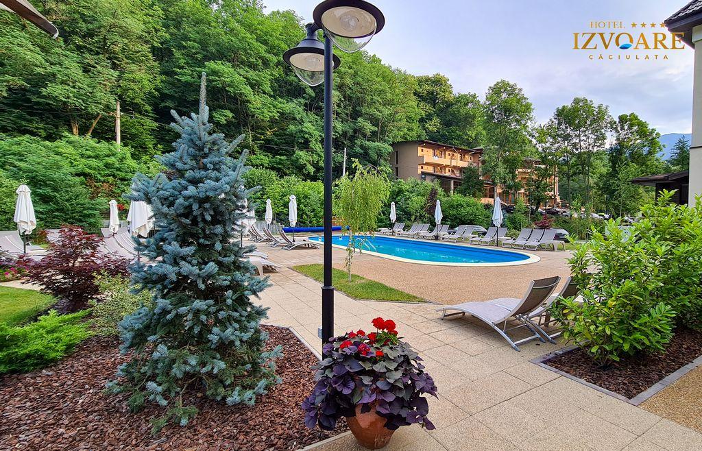 Hotel Izvoare Caciulata dispune de o piscina exterioara, piscina ce contine apa geotermala (temperatura apei fiind de 35-37 C iar adancimea piscinei de 1.4m). Apa provine de la unul dintre izvoarele termale , apa incalzita in subteran de activitatile geotermale ale pamantului, bogata in saruri, minerale si dioxid de carbon.